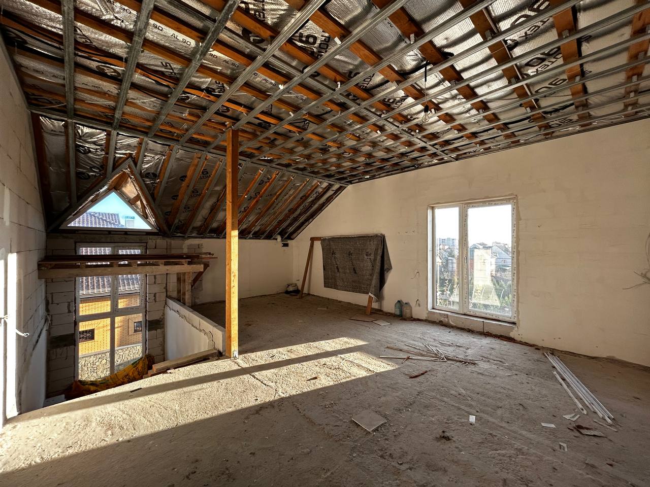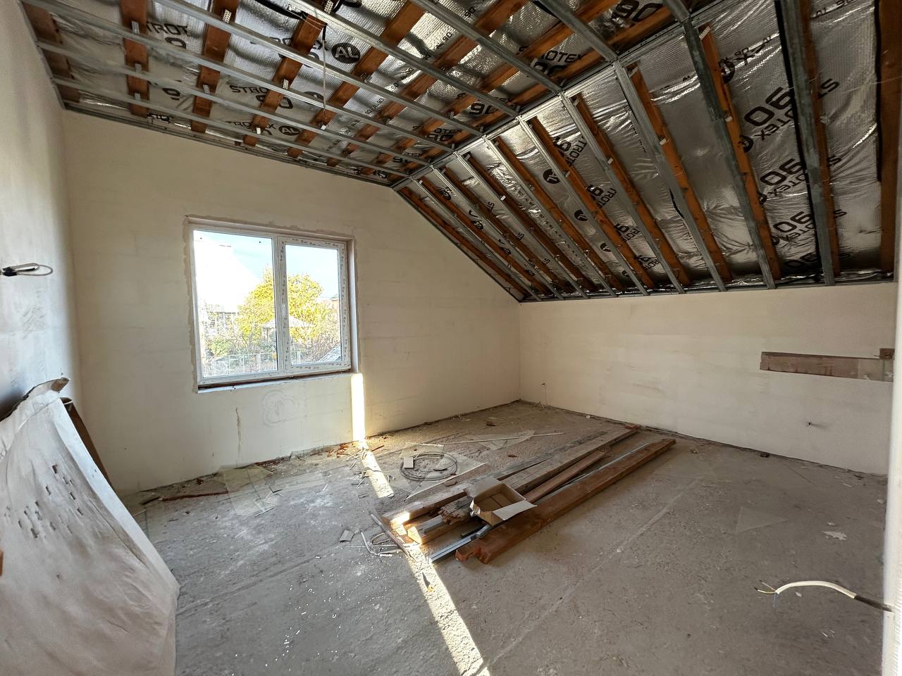 Електророзводка, штукатурка стін, каркас на сходи, вивід під камін, м/п вікна, вхідні двері, дах перекрито, бітумна черепиця, утеплено, гідро та шумоізоляція.