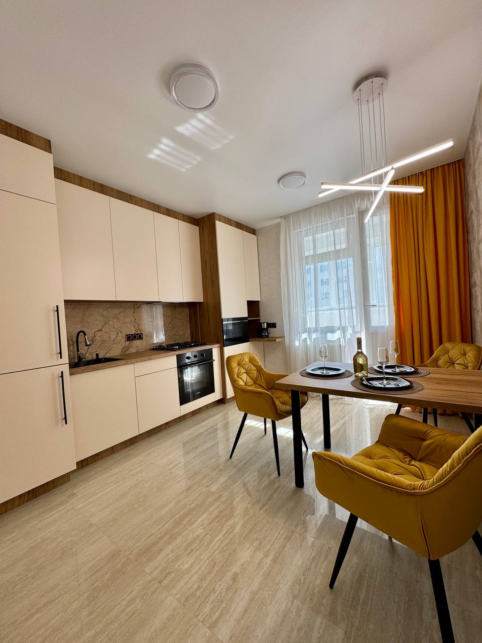 Простора стильна однокімнатна квартира з сучасним якісним ремонтом. Інтерʼєр в світлих пастельних тонах . Квартира повністю укомплектована сучасними меблями та побутовою технікою ( вмонтований холодильник, вмонтована мікрохвильова піч, духова шафа, варильна газова поверхня, витяжка, кавоварка) , сучасний телевізор діагональ 55, пральна машина. Кімната зонована ( двоспальне ліжко, розкладний диван, бьюті зона, зона TV) . Комфортний санвузол. Балкон утеплений, додатково встановлено радіатор.