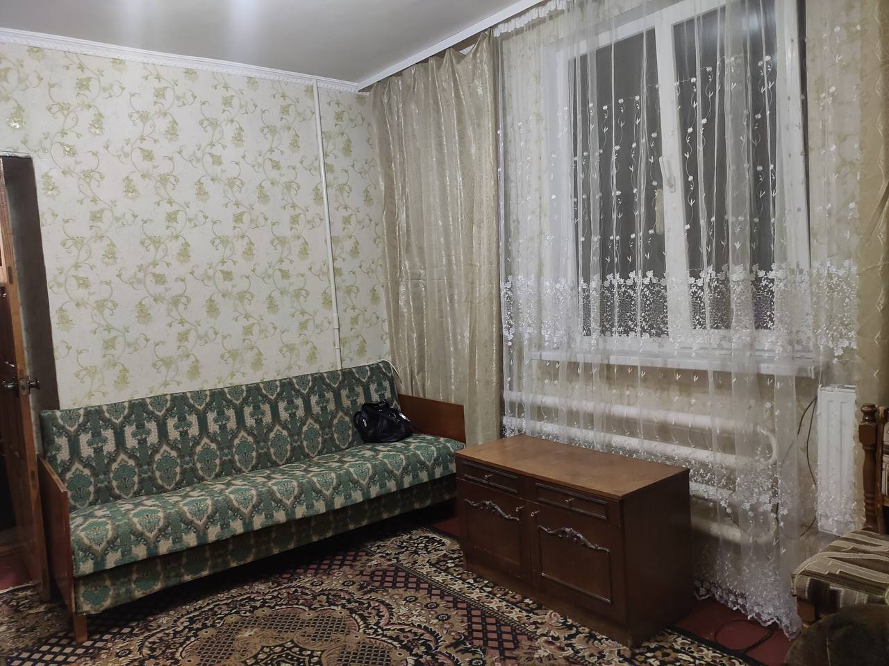 Перепланований гуртожиток, без балкона, власна ванна в кінці загального коридора. Є всі необхідні меблі і техніка.