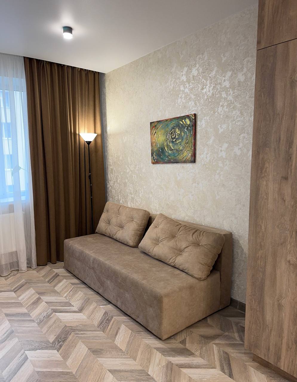 Кімната зонована- двоспальне ліжко та розкладний диван