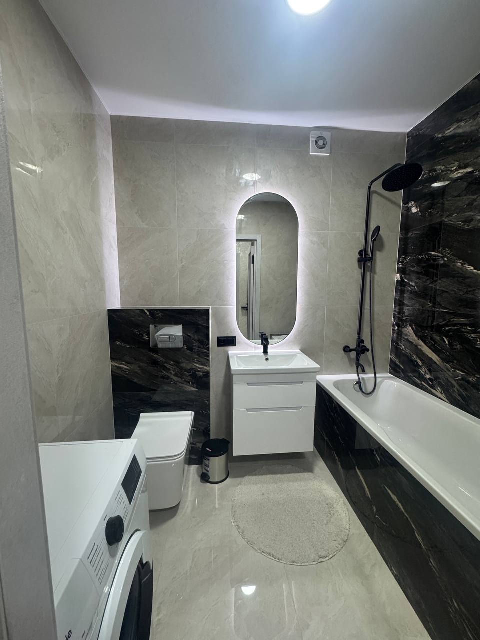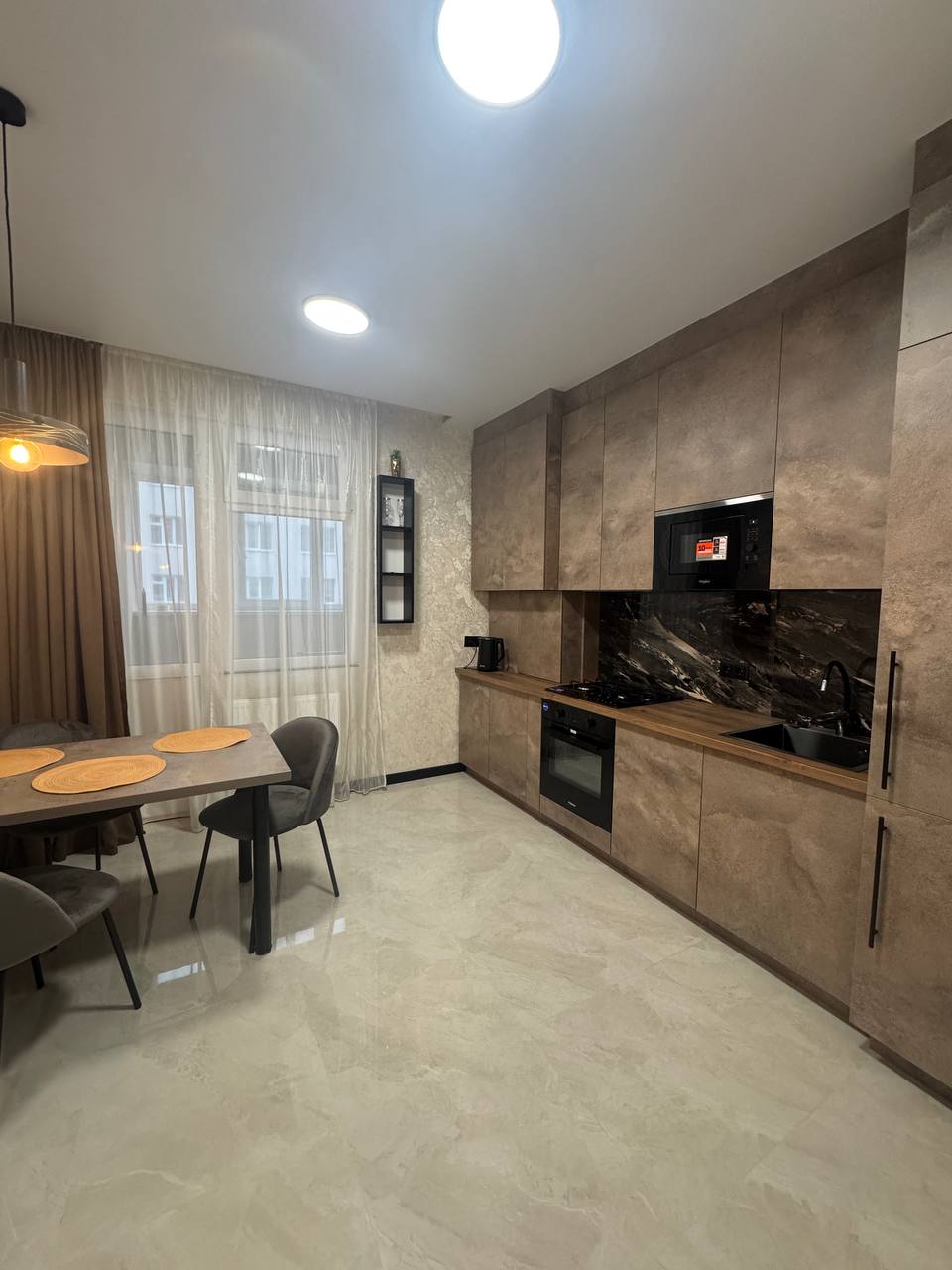 Техніка- холодильник, вмонтована мікрохвильова піч, духова шафа, варильна поверхня, витяжка, електрочайник, пилосос, пральна машина, телевізор.