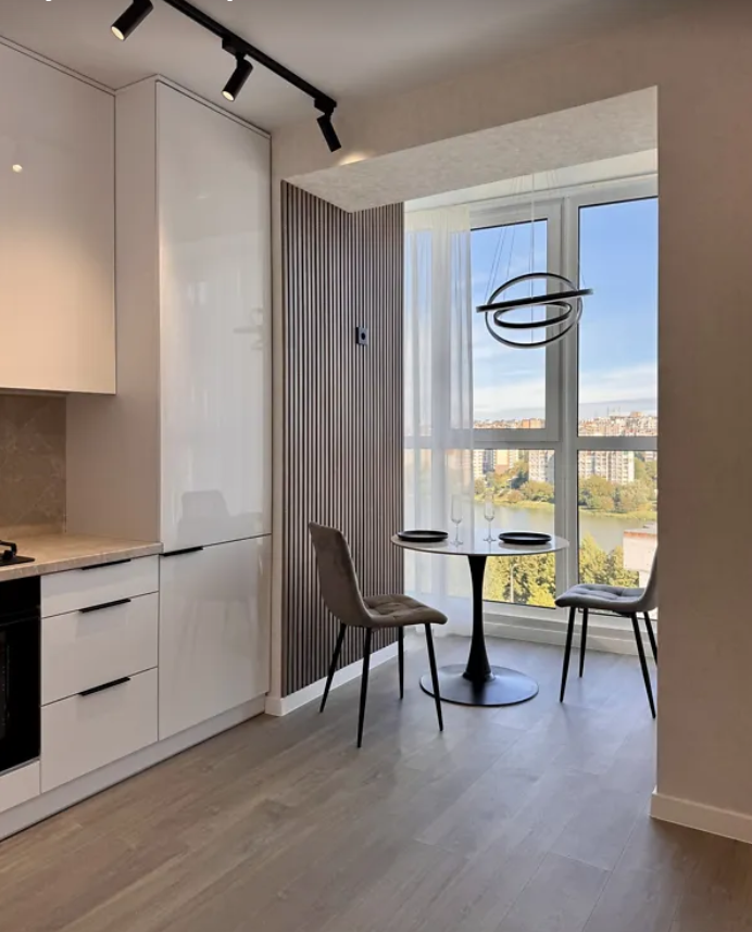 Сучасна 1-кімнатна квартира з панорамними вікнами та краєвидом на озеро.
