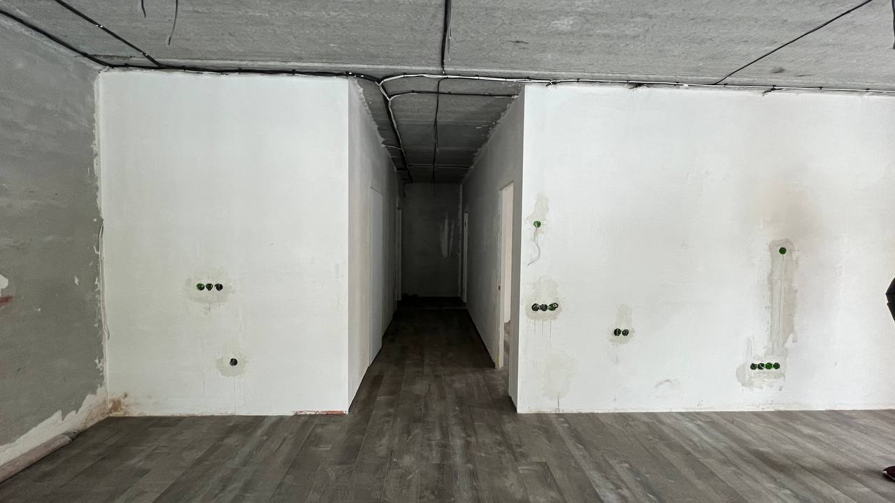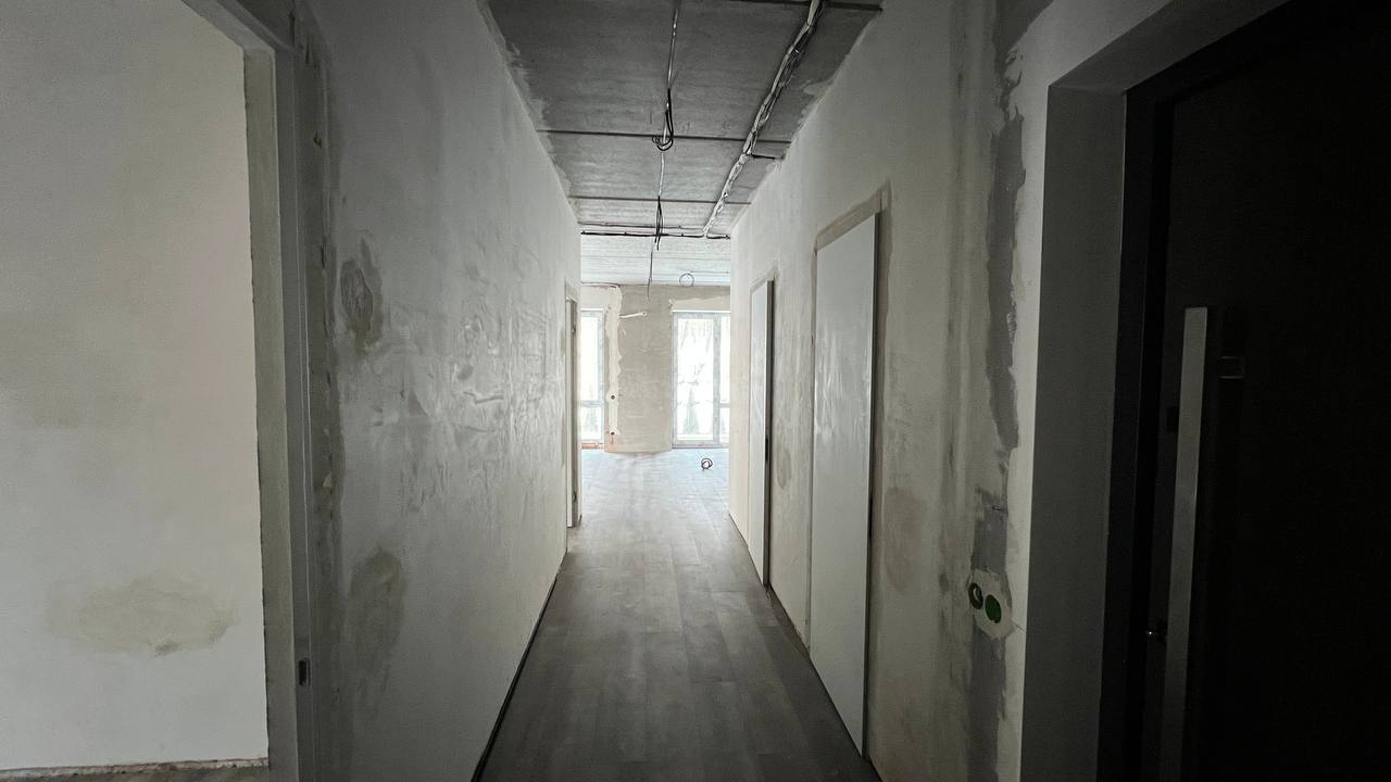 Квартира з виконаним чистовим ремонтом (незавершеним): стіни оштукатурені, проведена чорнова електрика, розведені труби водопостачання та опалення, встановлена система теплої підлоги по всій площі. Підготовлені магістралі для кондиціонерів. У ванній кімнаті вже укладена плитка, ванна Villeroy & Boch, рушникосушарка, придбані змішувачі Devit — для ванни з терморегулятором та для умивальника з настінним монтажем. Підлога виконана з якісної бельгійської дошки Quick-Step, двері — прихованого монтажу.